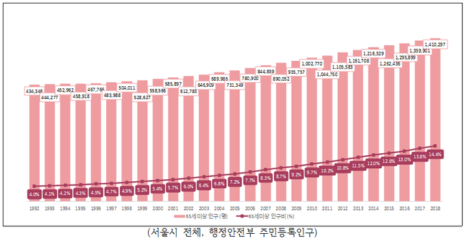 서울시 65세 이상 인구는 지속적으로 증가, 지난 2005년 ‘고령화 사회’(7%)에 진입한 데 이어 '18년 말 ‘고령 사회’(14%)에 진입했다. 이와 같은 노령인구 증가 추세를 고려하면 2026년 ‘초고령 사회’(20% 이상) 진입이 예상된다.