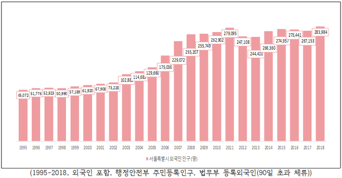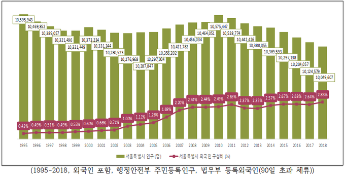 서울시 전체인구와 서울시 등록 내국인 수는 2010년 이후 꾸준히 감소 추세인 반면, 서울 거주 외국인은 '95년 4만5천여 명에서 '18년 28만4천여 명으로 23년 만에 6배 이상 증가했다.