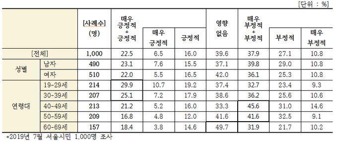 서울시민 1,000명을 대상으로 서울의 인구감소가 자신에게 미치는 영향을 물은 결과 “영향없다” 39.6%, “부정적” 37.9%, “긍정적” 22.5% 순으로 응답했다.