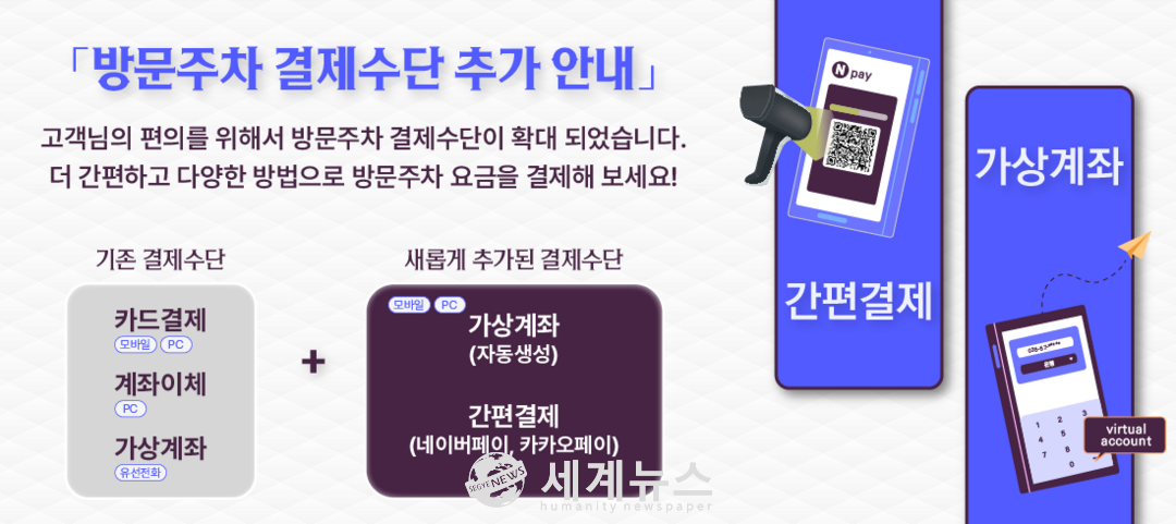 주차장에 설치된 QR코드를 통해 사용자는 별도의 앱 설치 없이 모바일 기기로 바로 접속하여 카카오페이, 네이버페이, 가상계좌 자동생성 등 다양한 결제수단을 이용할 수 있게 됐다. 특히 카드결제가 어려웠던 고령 이용자를 위해 가상계좌 자동발송 기능을 도입하여 결제를 더욱 손쉽게 할 수 있도록 개선했다.