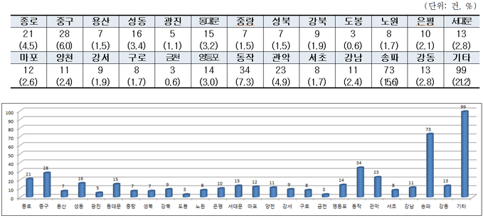 민원발생 지역별(자치구 기준)로는 ‘송파구’가 73건(15.6%)으로 1위이고, ‘동작구’ 34건(7.3%), ‘중구’ 28건(6.0%) 순이며, 송파구는 다양한 주제로 행정서비스 요구 민원이 대폭 증가한 것으로 분석되었다.