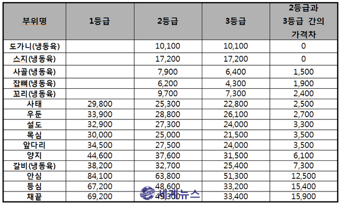 한우 2등급과 3등급 간의 가격차는 부위별로 다소 편차는 있으나 1kg 당 최대 15,900원, 최소 0원의 차이를 보이는 것으로 조사됐다.