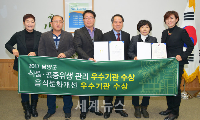 | ▲ 최형식 담양군수(오른쪽 3번째)는 26일 식품의약품안전처에서 주관한 음식문화개선사업 평가에서 ‘우수기관’으로 선정돼 기관 표창을 수상했다. © 세계뉴스 |