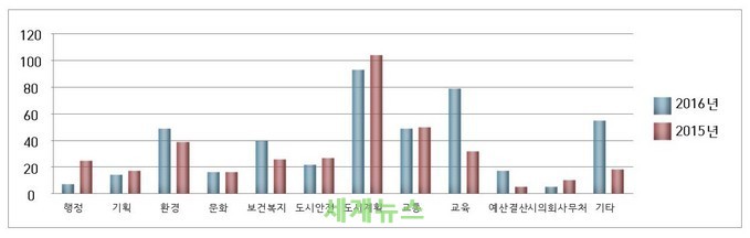 민원분야별로는 도시계획관리 분야 20.9%, 교육분야 17.7%, 교통분야 10.9%로 생활밀접 분야가 전체민원중 49.5%를 차지했다.