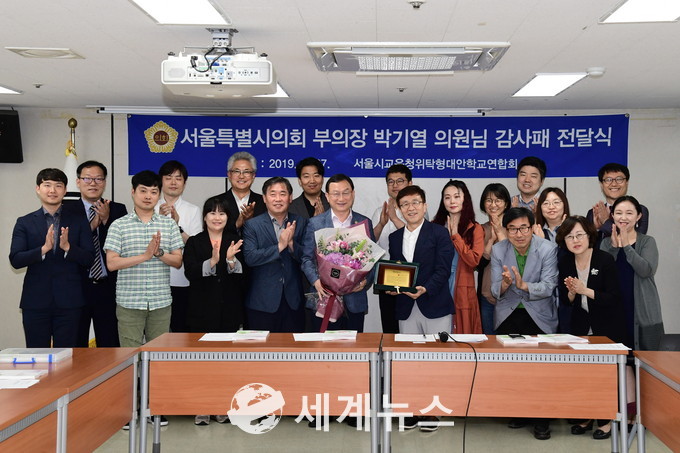 [세계뉴스] 정서영 기자 = 서울특별시의회 박기열 부의장(더불어민주당, 동작3)이 지난 27일 오후 3시 서울시 중구 동그라미 대안학교에서 열린 ‘2019 서울특별시교육청 위탁형 대안학교 연합회 정기총회’에서 서울시교육청 위탁형대안학교 연합회(회장 이희용)로부터 감사패를 수상했다.