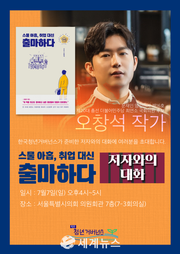 [세계뉴스] 윤소라 기자 = 한국청년거버넌스가 ‘스물아홉, 취업대신 출마하다’를 저술한 오창석 작가를 초청해 저자와의 대화 자리를 마련한다.