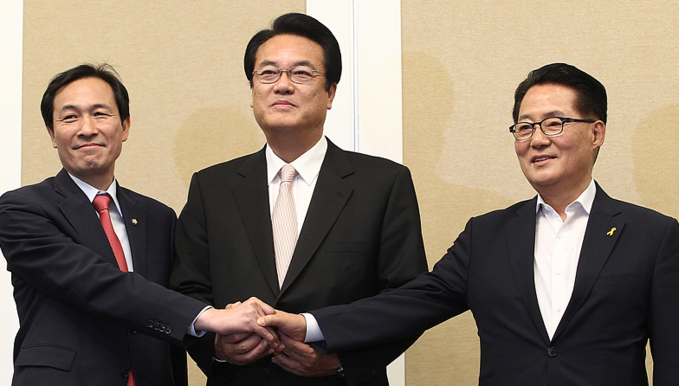 | ▲ 더불어민주당 우상호, 새누리당 정진석, 국민의당 박지원 원내대표가 손을 맞잡고 있다. © 세계뉴스 |