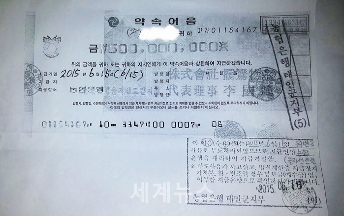 | ▲ 6월 16일 농협은행 을지로센트럴지점에서 발급된 5억원권 약속어음이 최종 위변조된 가짜로 판명됐다. 앞서 6월 10일 일련번호가 같은 어음이 입금 되었다. 또한 (주)파란물산의 발행사 어음은 5월 26일 최종부도처리된 것으로 드러났다. © 세계뉴스 |