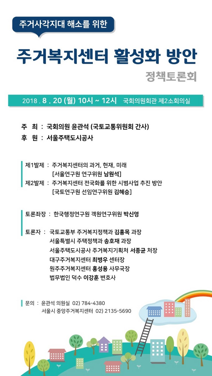 [세계뉴스] 전승원 기자 = 서울주택도시공사는 국회 국토교통위원회 윤관석 의원실과 함께 20일 오전 10시 국회의원회관 제2소회의실에서 ‘주거사각지대 해소를 위한 주거복지센터 활성화 방안 정책토론회’를 개최했다.