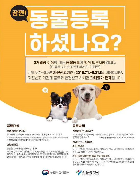 이와 같이 농식품부는 자진신고 기간 이후인 9월부터는 시·군·구별로 반려동물 미등록자, 정보변경 미신고자를 집중 단속할 방침이다.