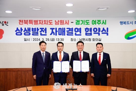 [세계뉴스 이정열 기자] 전북특별자치도 남원시와 경기도 여주시가 29일 남원시청 회의실에서 최경식 남원시장, 이충우 여주시장, 전평기 남원시의회 의장, 정병관 여주시의회 의장 등이 참석한 가운데 공동 발전과 우호 증진을 위한 자매결연 협약을 체결했다.