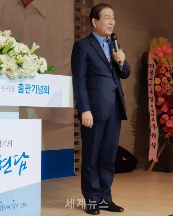 | ▲ 24일 오후 5시 중랑구 묵동 소재 웨딩그룹 위더스 중랑 6층에서 열린 류경기 전 서울시 부시장의 '우문현답-서울을 바꾼 지혜와 용기' 출판기념회에서 박원순 서울시장이 축사를 하고 있다. © 세계뉴스 |