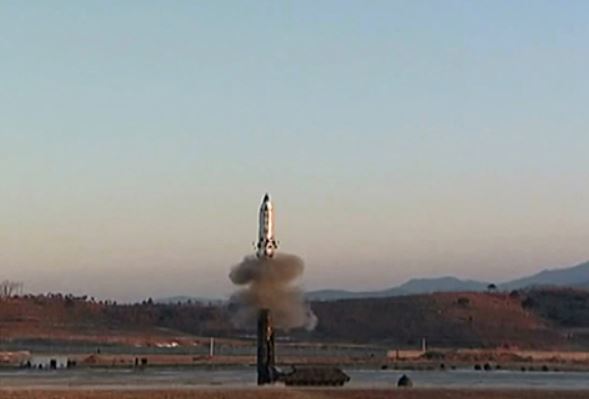 | ▲ 12일 오전 7시55분경 평북 영현 비행장 주변의 이동발사체에서 발사되는 '북극성2형' © 세계뉴스 |