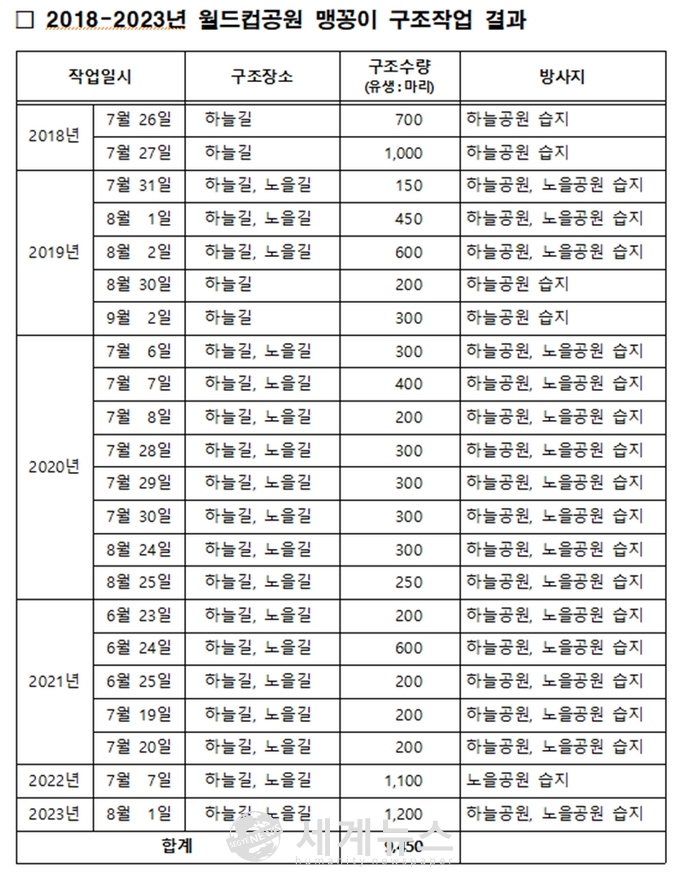 특히 주목할 만한 것은 2010년 한강 노들섬에서 노을공원으로 이주시킨 맹꽁이 성체 9마리가 번식한 결과, 금년(23.8.1) 하루에 하늘길, 노을길 거리로 나온 맹꽁이 1,200마리를 구조하여 하늘, 노을공원 습지에 방사했다고 최근 통계자료에서도 나타난 바 있는데, 이 같은 결과에 대해 김 의원은 “실제 서식하는 맹꽁이 수는 10,000여 마리 이상이라고 추정할 수 있다”고 언급하기도 했다.