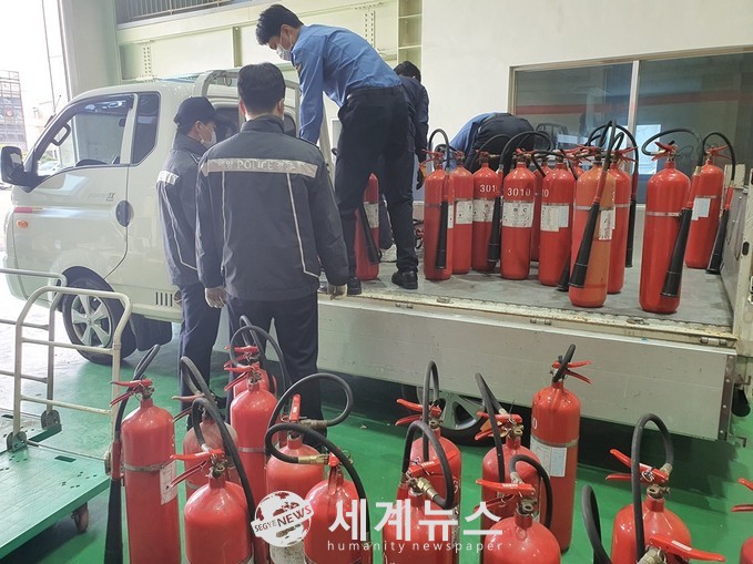 [세계뉴스 윤준필 기자] 군산해경이 장시간 사용으로 폐기처분할 예정이었던 불용 소화기를 교육 훈련용으로 활용한다.