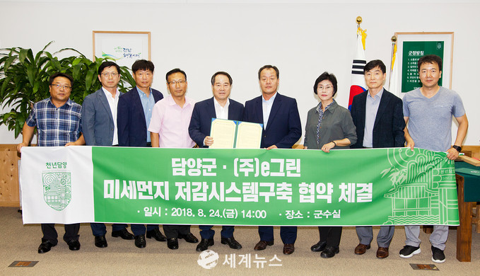 | ▲ 24일 (주)e그린과 담양군이 '미세먼지 저감시스템 구축 사업' 업무협약을 체결했다. 최형식 담양군수(외쪽 가운데)가 협약서에 서명하고 기념쵤영을 하고 있는 모습. |
