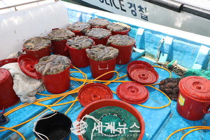 [세계뉴스 윤준필 기자] 보령해양경찰서(서장 하태영)는 19일 ‘백주대낮’ 서천 앞바다에서 허가 없이 잠수장비를 이용해 해삼과 조개 233kg을 불법포획한 어선 A호의 선장 등 일당 3명이 보령해경에 적발되었다고 밝혔다.