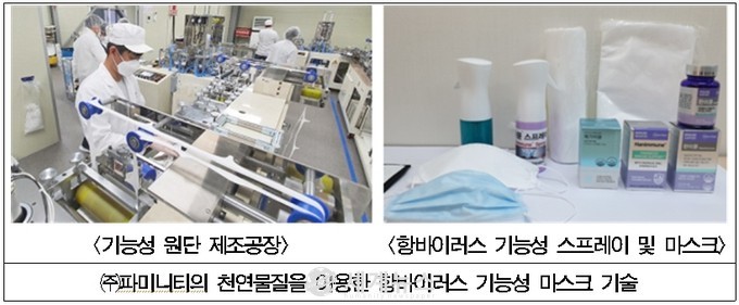 세번째 수상작은 ㈜파미니티에서 제안한 식물추출물을 이용한 항균 기능성 마스크 기술이다. 파미니티는 국내에 자생하는 엉겅퀴, 민들레 등으로부터 항바이러스, 항균, 탈취 기능의 물질을 개발하였으며, 스프레이 또는 원단 형태로 마스크에 적용할 수 있다.