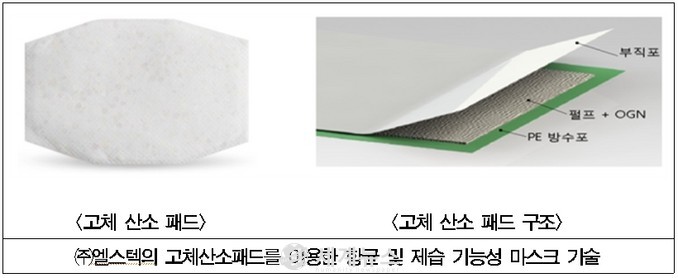 두번째 수상작은 ㈜엘스텍에서 제안한 고체산소기술이 적용된 항균 기능성 마스크 기술이다. 본 기술은 강력한 항균 기능이 있는 고체산소를 마스크 부착형 패드로 제작하여 기존 KF80과 K94 마스크에 활용할 수 있다. 또한 고체산소패드는 뛰어난 제습기능으로 탈취와 KF80, 94 마스크의 정전기 기능 유지에도 효과적이다.