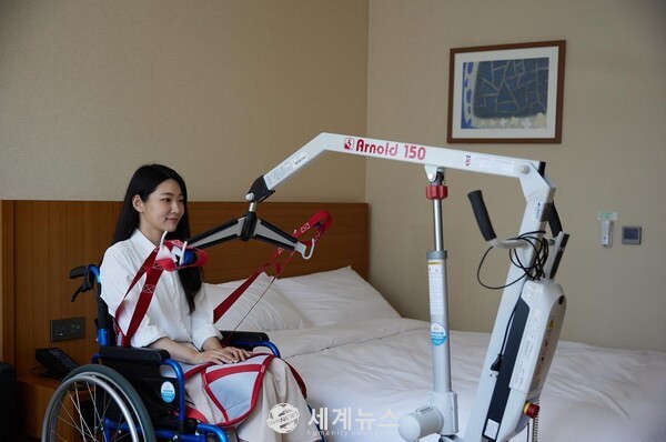 | ▲ 이동형 리프트를 이용하여 침대로 옮겨 앉는 투숙객. (서울관광재단 제공) |