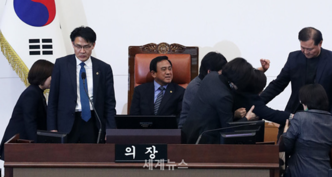 | ▲ [세계뉴스] 조홍식 기자 = 20일 오후 서울시의회 본회의장에서 열린 제279회 임시회 제1차 본회의에서 더불어민주당과 자유한국당 소속 의원들이 4인 선거구 확대를 요구하며 의장석을 점거한 바른미래당과 민주평화당 소속의 동료의원들을 끌어내고 있다. 양준욱 의장이 의장석에 앉은채로 그 광경을 지켜보고 있다. 서울시의회는 6·13 지방선거를 앞두고 추진됐던 서울시 기초의회 4인 선거구 신설은 더불어민주당과 자유한국당의 힘에 부딪쳐 끝내 무산됐다. |