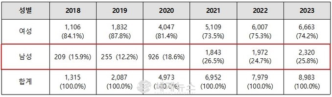 최근 한국여성인권진흥원의 자료에 따르면, 디지털 성범죄 남성 피해자 수는 2018년 209명에서 꾸준히 증가해 2023년 2,320명으로 약 11배 이상 급증했으며, 여성긴급전화 1366을 통해 가족폭력이나 스토킹, 데이트 폭력 등을 상담 받은 남성 건수가 2023년 17,333건을 넘어서 전체의 5.9% 수준이라고 발표했다.