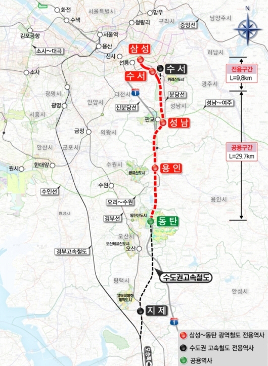 서울(삼성)∼경기(동탄), 총사업비 1조5,547억 원, 정거장 5개소, 연장 37.9km, ’21 개통(삼성∼수서간 9.8km 신설, 수서∼동탄간 28.1km는 수도권 고속철도 선로 활용)